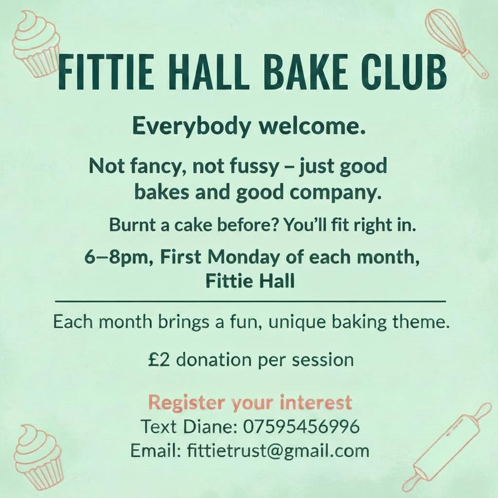 Join the Fittie Hall Bake Club on the first Monday of the month. Every month there will be a new theme. No experience necessary – just be willing to have fun and eat cake! 🎂